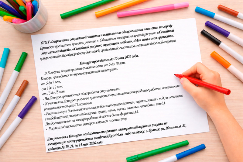 20.02.2026 г. в 15:00 в здании ОГБУ «УСЗСОН по г. Братску» по адресу: ул. Южная, д. 81, актовый зал состоится «День консультаций для участников СВО и членов их семей» по вопросам оказания государственной социальной помощи на основании социального контракта. при участии: - начальника отдела по работе с участниками СВО и членами их семей, специалиста отдела социального сопровождения инвалидов ОГБУ «УСЗСОН по городу Братску»; - начальника отдела предоставления государственной социальной помощи на основании социального контракта ОГБУ «УСЗСОН по городу Братску»; - социального координатора Филиала государственного фонда «Защитники Отечества» по Иркутской области; По всем возникшим вопросам обращаться по телефонам: 8 (3953) 45-67-04, 45-53-55.