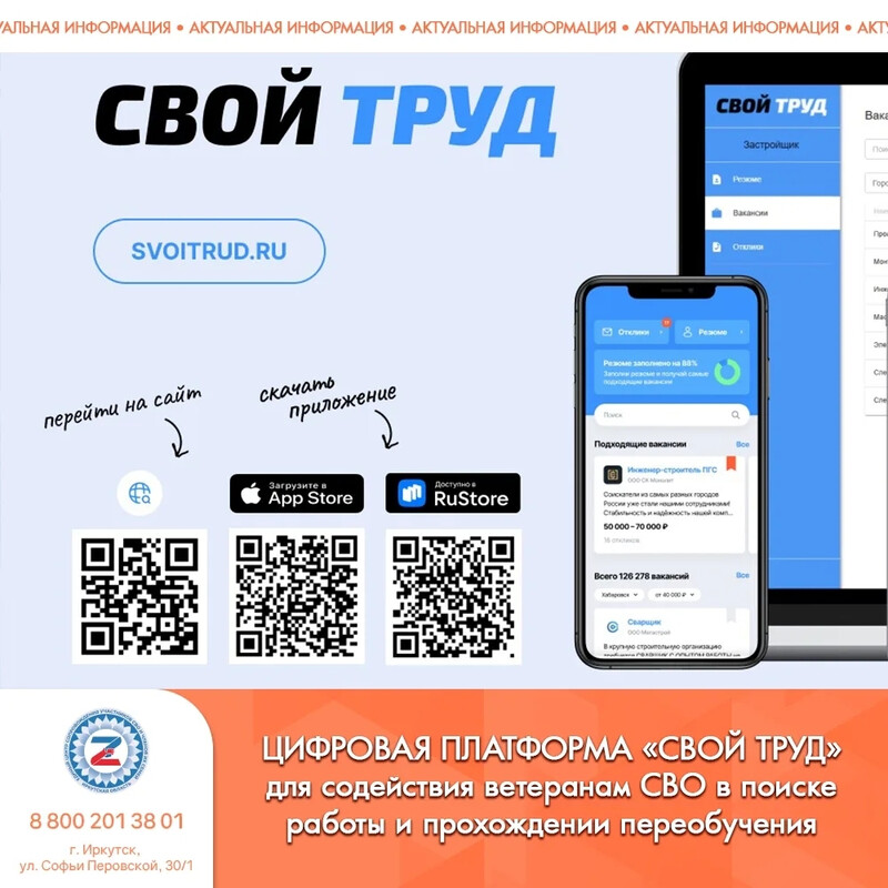 Ассоциация ветеранов специальной военной операции совместно с Министерством строительства Российской Федерации и ПАО «Ростелеком» запустила цифровую платформу «СВОй труд» – сервис для содействия в трудоустройстве участников СВО.